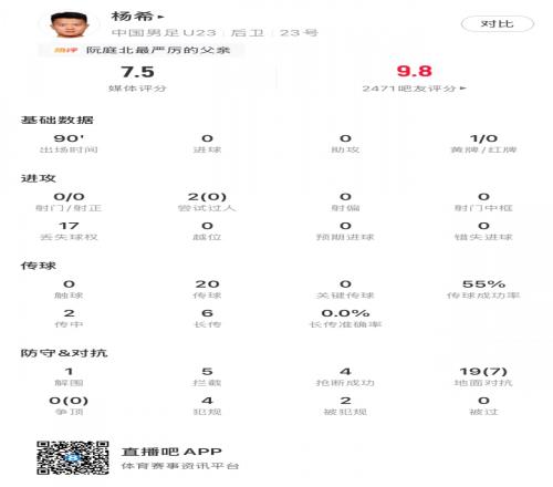 体育播报01月21日宣 U23国足3-0越南U23,杨希首发打满全场获评7.5分。