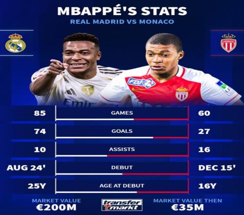 体育播报1月20日宣 皇马将在本轮欧冠对阵摩纳哥,当家球星姆巴佩也将和自己的青训母队重逢。《转会市场》也对比了他两段生涯的关键数据: